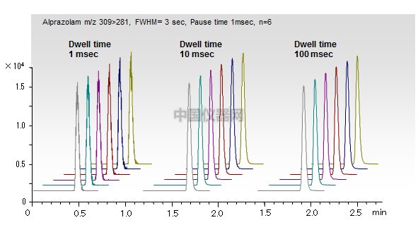 2、 阿普唑侖超快速質(zhì)譜分析,MRM離子對(duì)為309>281。延遲時(shí)間為1ms,考察在不同駐留時(shí)間下的分析重現(xiàn)性。