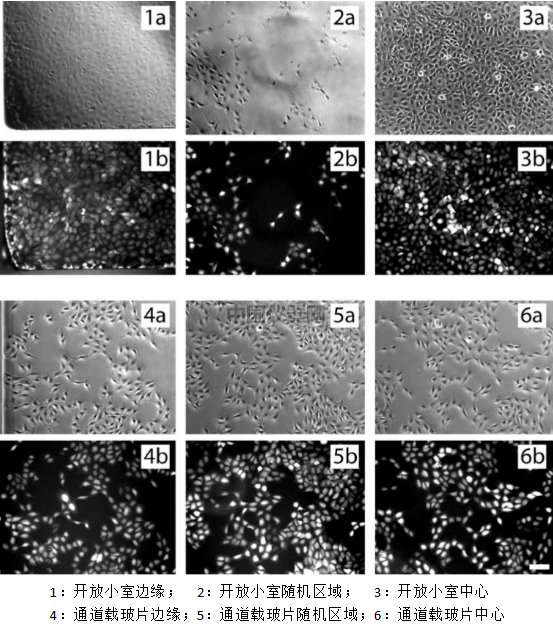 在通道載玻片中,由于沒有培養皿壁的影響,鋪入細胞后,不需要平時的混勻操作,細胞的分布就非常均勻了。而使用開放小室,有可能在鋪細胞混勻后,細胞還是會聚集在小室的邊緣或中間位置上。如下圖所示。a 是明場相差成像,b為熒光成像。