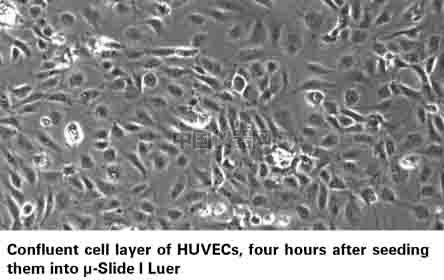 這里我們以HUVEC細胞為例,使用ibidi流體剪切力系統(tǒng)進行一個流體條件下的細胞培養(yǎng)與靜置狀態(tài)下的細胞培養(yǎng)的對比實驗。 一.實驗準備實驗材料及設(shè)備 1.細胞: HUVECs細胞系 2.培養(yǎng)基:Endothelial Cell Growth Medium(PromoCell,Germany,C-22010) 胎牛血清 3.培養(yǎng)耗材:ibidi單通道載玻片μ-Slide I0.6 Luer (ibidi,Germany,80186) 灌流管,15cm,1.6mm直徑(ibidi,Germany,10962) 封口夾 1.儀器設(shè)備:ibidi流體剪切力系統(tǒng),含空氣泵(ibidi,Germany,10905)和流體單元(ibidi,Germany,10903) 一.實驗方法 在實驗開始前一天,請將所有需要使用的試劑,培養(yǎng)基,通道載玻片,灌流管都在37℃的二氧化碳培養(yǎng)箱中放置過夜,排除由于溫度差產(chǎn)生的微量氣泡。 一.)培養(yǎng)細胞 準備HUVECs細胞系,按照常規(guī)細胞培養(yǎng)方法進行培養(yǎng)。使用比較健康的內(nèi)皮細胞,以防在做流體實驗時候細胞不能穩(wěn)定貼壁。我們建議使用內(nèi)皮細胞培養(yǎng)基+10%FCS培養(yǎng)HUVEC。使用4代以內(nèi)的HUVEC。已獲得較好的實驗結(jié)果。 按照下面流程鋪細胞: 1.將150μl的1.6 x 106 cells/ml密度的細胞懸液加入通道載玻片中,注意,將移液器頭插入注液孔中再加入細胞懸液,可以輕微傾斜通道載玻片幫助細胞懸液充滿整個通道(圖一)。 圖一:鋪細胞,將槍頭插入注液孔中再打入細胞懸液。
