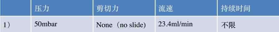 圖五。 1.開始流體剪切力實驗(單向?qū)恿鳎⒋罱ê玫牧黧w單元與流體剪切力泵相連后,將整個流體單元放入二氧化碳培養(yǎng)箱中。打開控制軟件,設(shè)置實驗條件與步驟。為了使貼壁細胞適應(yīng)剪切力培養(yǎng)環(huán)境。先用低剪切力刺激,逐步提高并且保持在一定的剪切力(表二)。