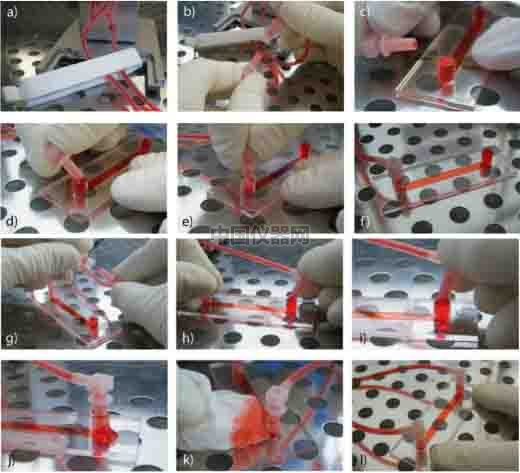 圖四:a)封口夾輕輕將灌流管的硅膠管夾住。b)將其中一個(gè)魯爾接頭從中間的鏈接管中拔出。c-j)按圖示,將魯爾接頭與通道載玻片的注液孔相連,注意不能產(chǎn)生氣泡,會(huì)有部分培養(yǎng)基溢出。k)連接好后,將封口夾移除,用無(wú)塵紙將溢出的培養(yǎng)基擦除。l)全部連接好后,用顯微鏡觀測(cè)一下通道內(nèi)的細(xì)胞狀態(tài)。 3)檢查灌流系統(tǒng)是否密封、是否將灌流管插入了正確的閥門。將封口夾夾住其中一根硅膠管,如果兩邊的灌流儲(chǔ)液管液面不會(huì)下降或者上升,那么,整個(gè)系統(tǒng)就是密封的,并且是正確安裝的(圖五)。