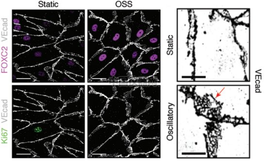 在振蕩剪切力的刺激下,研究人員檢測(cè)了FOXC2和細(xì)胞增殖生物標(biāo)記物Ki67的表達(dá)情況。從圖上可見(jiàn),在OSS的刺激下,F(xiàn)OXC2有非常顯著的表達(dá)(粉色)而,代表細(xì)胞增殖的Ki67的表達(dá)則顯著下降。與此同時(shí)針對(duì)VE-cadherin細(xì)胞聯(lián)合的染色表明,在有OSS刺激的情況下,VE-cadherin細(xì)胞聯(lián)合的面積明顯變大。
