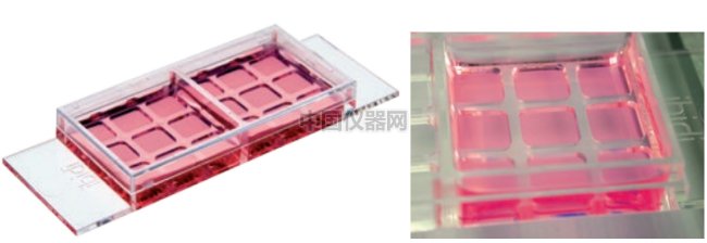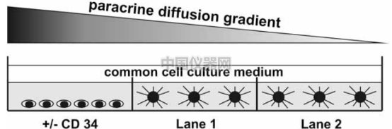 細胞共培養實驗是將2種或2種以上的細胞共同培養在同一環境中的實驗,更好的模擬體內細胞互相通信的生理情況。一般有兩種共培養方法:1)直接接觸共培養體系:是指直接將2種或2種以上的細胞按照一定比例混合,鋪在一個孔中;2)間接接觸共培養體系:是指將不同種類的細胞共用一種培養環境,而不互相接觸,查看細胞分泌因子對另外的細胞的影響。這里我們介紹的是采用間接接觸共培養的方法,研究CD34祖細胞的分泌物對由內皮細胞組成的細胞團在血管形成上的影響。 文中,研究人員將CD34祖細胞和內皮細胞團共培養后發現,CD34祖細胞使內皮細胞團血管生成的出芽長度增長了18%,如果在此基礎上將氧濃度從20%降低到1%,血管生成的出芽長度增長了52%。說明CD34細胞和低氧情況都會促進內皮細胞血管生成的發生  圖一:ibidi共培養載玻片特點,可見載玻片上有2個大孔,可以做兩組平行實驗。其中每個大孔中有9個小孔。可以分別鋪不同的細胞,細胞互相分開而生長在同一個培養環境中。 一.實驗設計 1)將共培養載玻片上其中一個大孔中的9個小孔分為三列:左邊一列鋪入 7*104 的CD34祖細胞,中間和右邊兩列均按照每孔7個HUVEC細胞團與collagen gel相混鋪入每個孔中(圖二)。