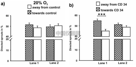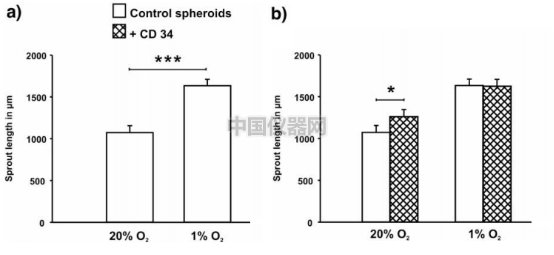 圖四:a)無CD34的存在時,低氧環境使得血管生成出芽長度有顯著的提升。B)在同樣濃度下,CD34祖細胞也會使內皮細胞團的出芽長度有顯著的提升。 3.20%氧濃度下,與CD34細胞共培養的細胞團血管生成出芽方向結果(圖五):