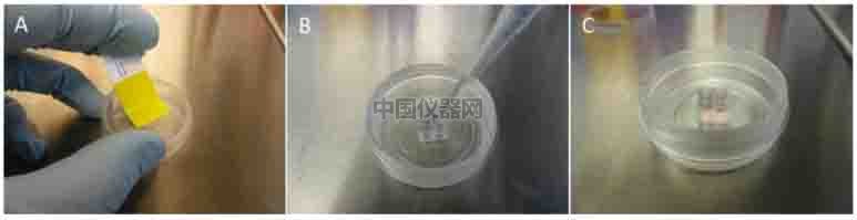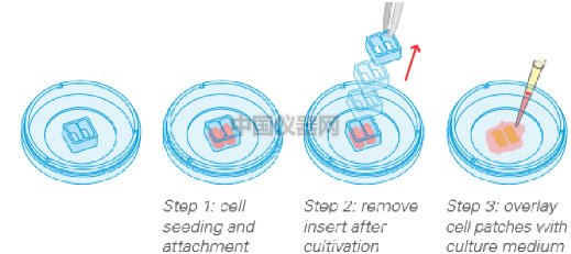 圖三:A. 去除培養皿底部的保護膠帶。B.C.在ibidi傷口愈合插件中加入細胞。 1.形成“劃痕” ● 采用無血清MEM培養基培養細胞4小時 ● 如圖四所示,小心的用鑷子夾住插件的一個角,將插件移除。  ● 移除插件后,要用顯微鏡檢查是否形成合格的“劃痕”。 ● 小心的清洗細胞,之后加入2ml培養基進行培養(圖五)。