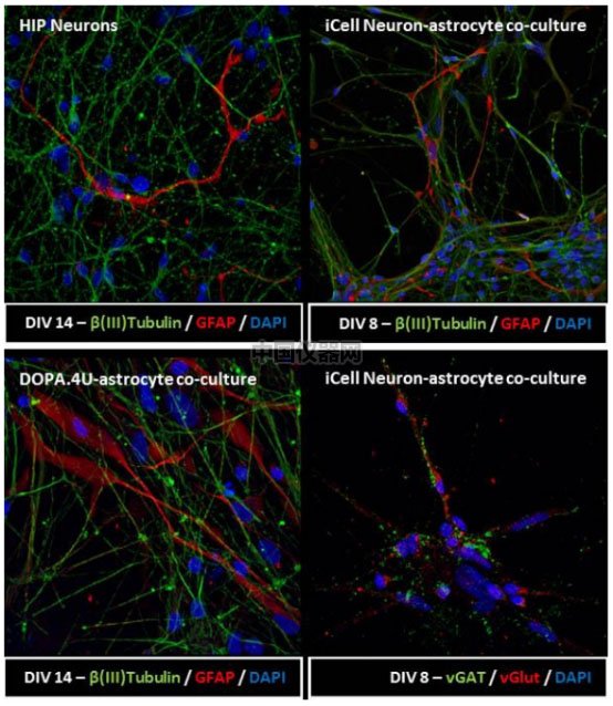 圖三:iPSC-derive神經元的免疫熒光染色結果。不同種類的人源iPSC-derive神經元使用β(III)tubulin(綠色)和GFAP(紅色),用來區分神經元和星型膠質細胞(HIP® neurons, 左上;DOPA.4U® neurons,左下;iCell neurons,右上。) Human iCell 神經元用vGAT (綠色) 和vGluT (紅色)確定壓制或激活突觸(右下)。細胞核使用DAPI染色(藍色)。