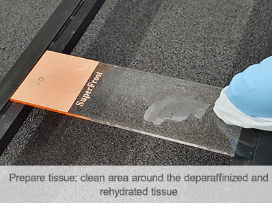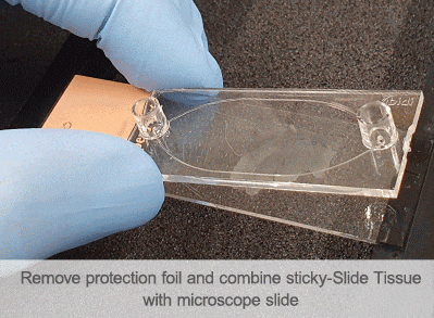 實(shí)驗(yàn)工作流程: Sticky-Slide Tissue粘性-組織切片通道載玻片提供了一個簡單、便捷的工作流程,可在載玻片安裝的組織切片上創(chuàng)建一個節(jié)省空間的通道。在對組織進(jìn)行脫石蠟處理和再水化后,取下襯底并將粘性載玻片放在顯微載玻片上,即可為組織切片創(chuàng)建一個方便的染色室。 使用移液管手動執(zhí)行染色方案,或使用自動化設(shè)備(如管路和泵等)進(jìn)行多重染色。